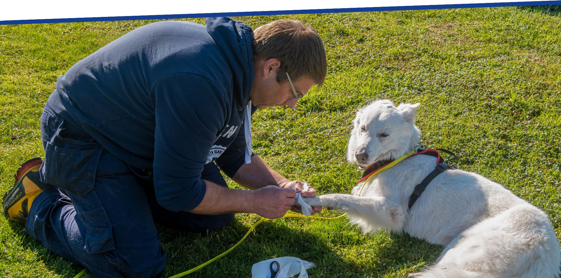Auf dem Hundeplatz wurde dann das Abwarten, Leinenführigkeit und Abrufen durch herumstehende Menschen gezeigt. Danach war ein Tierarztbesuch angesagt. Auf einem Tisch wie in der richtigen Praxis wurde der Hund untersucht. Die Hundebesitzer mussten demonstrieren, wie ein Maulkorb und eine Maulschlinge angelegt werden. Danach kam wohl die grösste Herausforderung für alle: das Anlegen eines Verbandes an einer Pfote. Dies alles wurde unter den fachfraulichen Augen von Barbara souverän gemeistert und danach mit den Teilnehmenden auch besprochen.